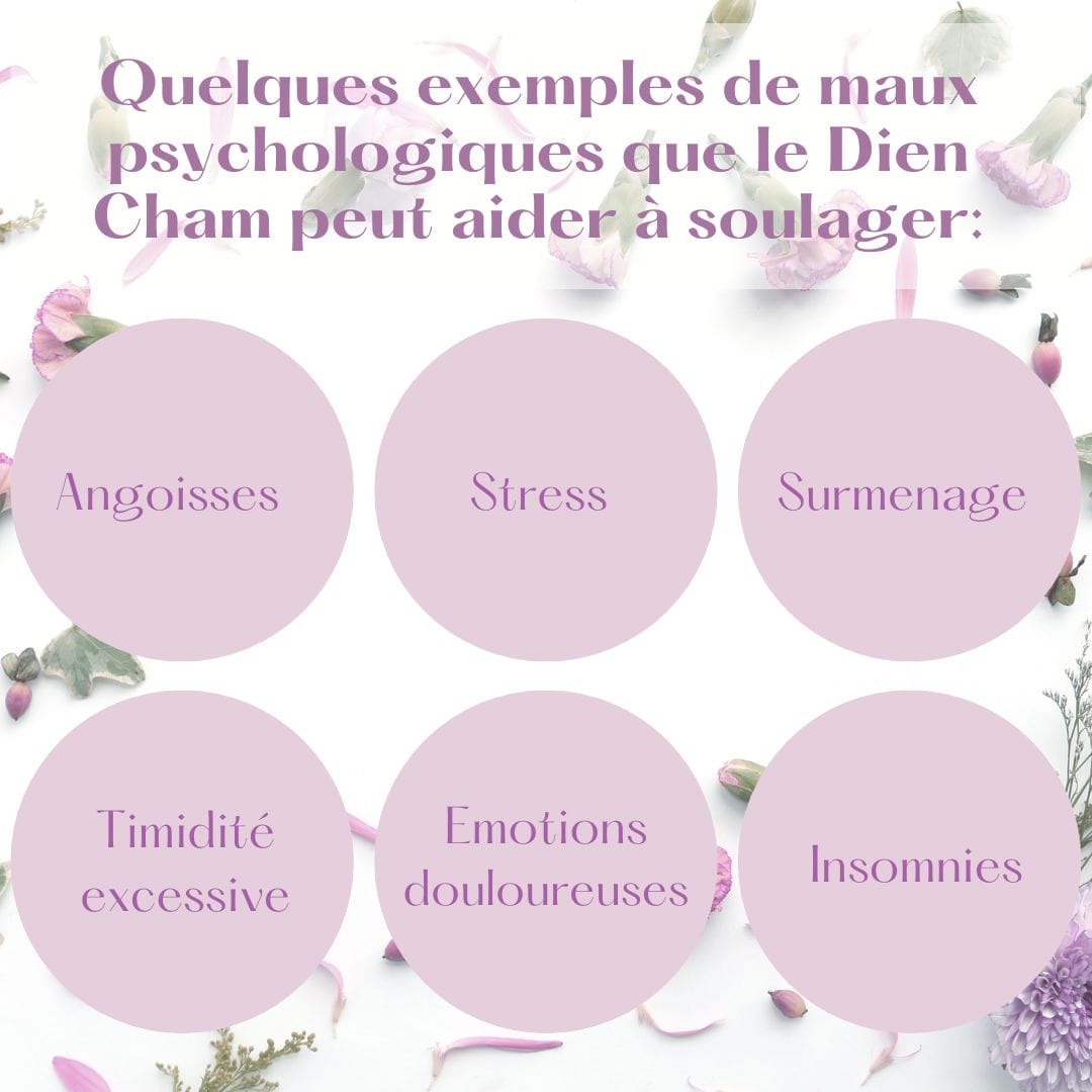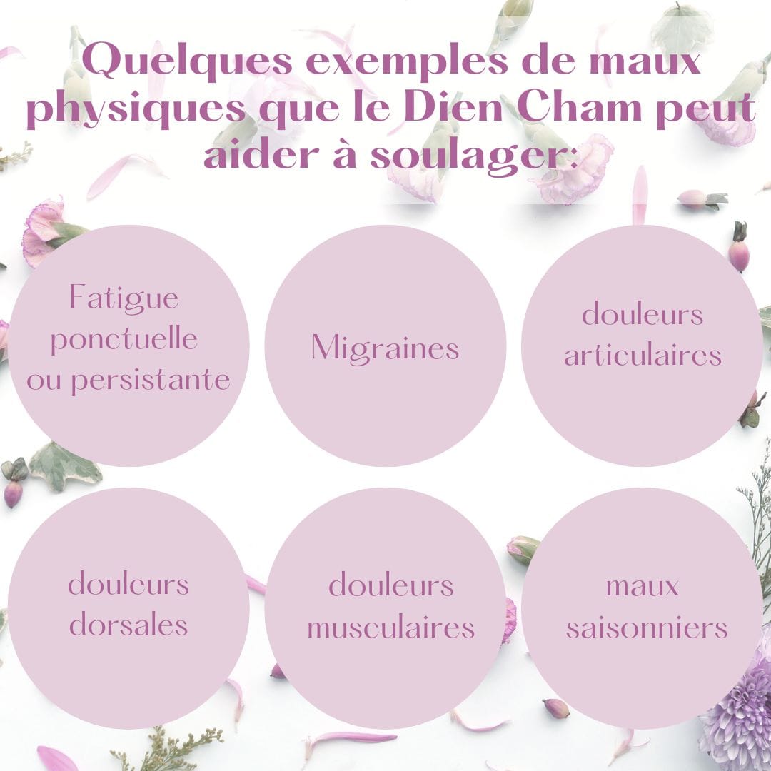Le Dien Cham est une méthode curative et préventive, un rééquilibrage pour entretenir sa santé en complément de la médecine. Elle ne se substitue pas à un traitement médicamenteux. Je ne pose aucun diagnostique médical.
